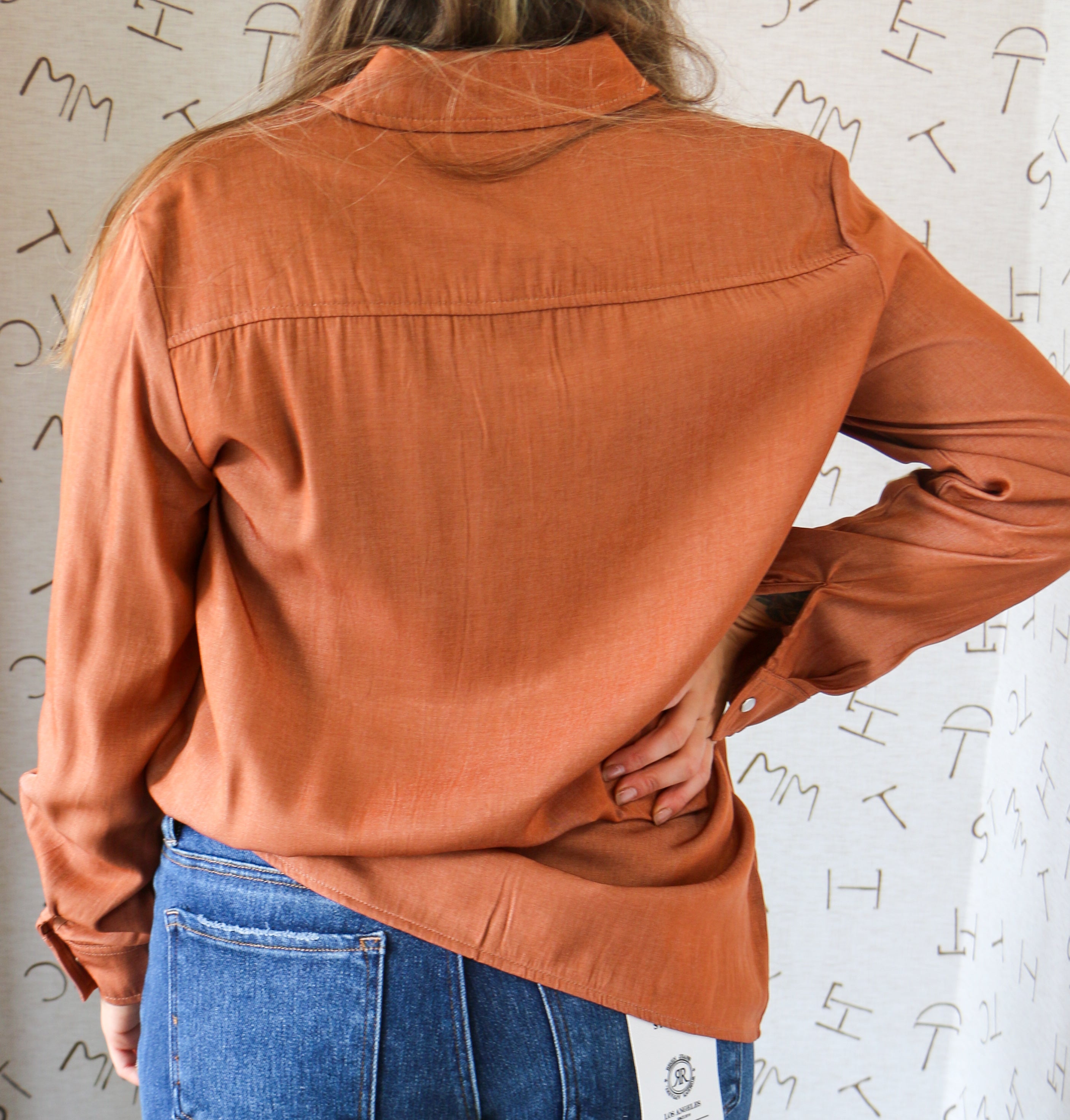 A western staple with a modern edge—this rust orange pearl snap shirt is made for everything from rodeo nights to everyday wear. Featuring a chest pocket, crisp collar, and shiny pearl snaps, it’s a versatile piece that pairs easily with denim, skirts, or boots. The rich rust hue adds that perfect pop of color while keeping it classic cowgirl chic.