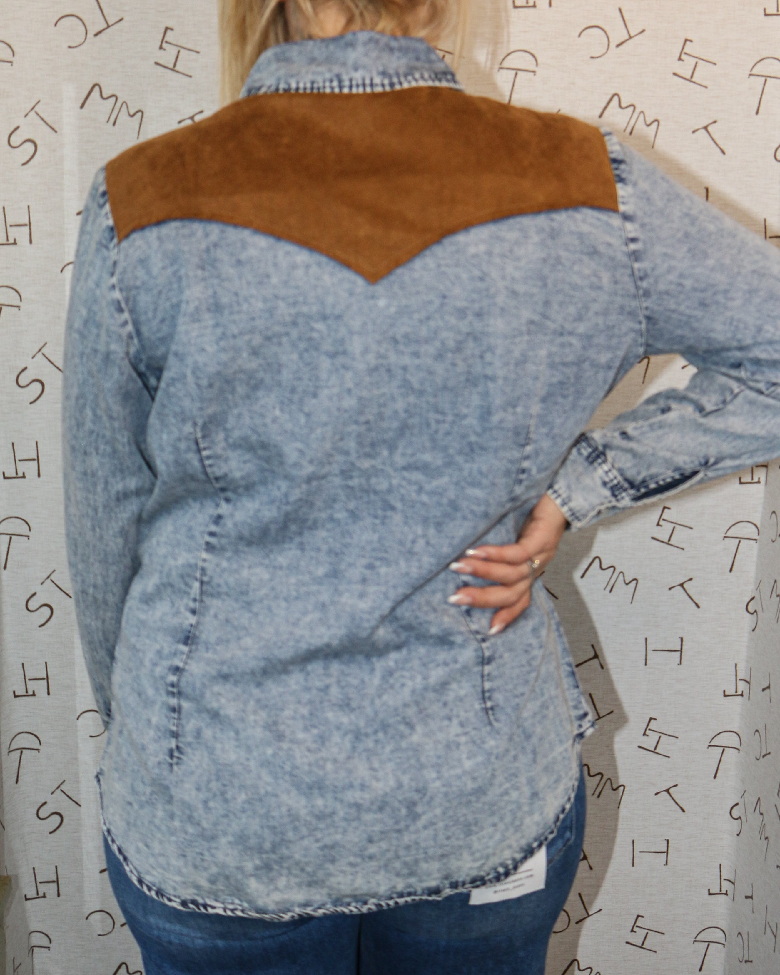 A timeless western staple with modern flair, this denim pearl snap shirt features a contrasting faux-suede yoke in rich caramel brown. Designed with classic pearl snaps down the front and at the cuffs, it’s the perfect blend of rugged and chic. Layer it over a tee for a laid-back look or dress it up with boots and jewelry for rodeo nights and concerts.