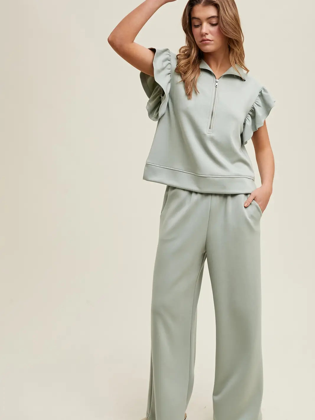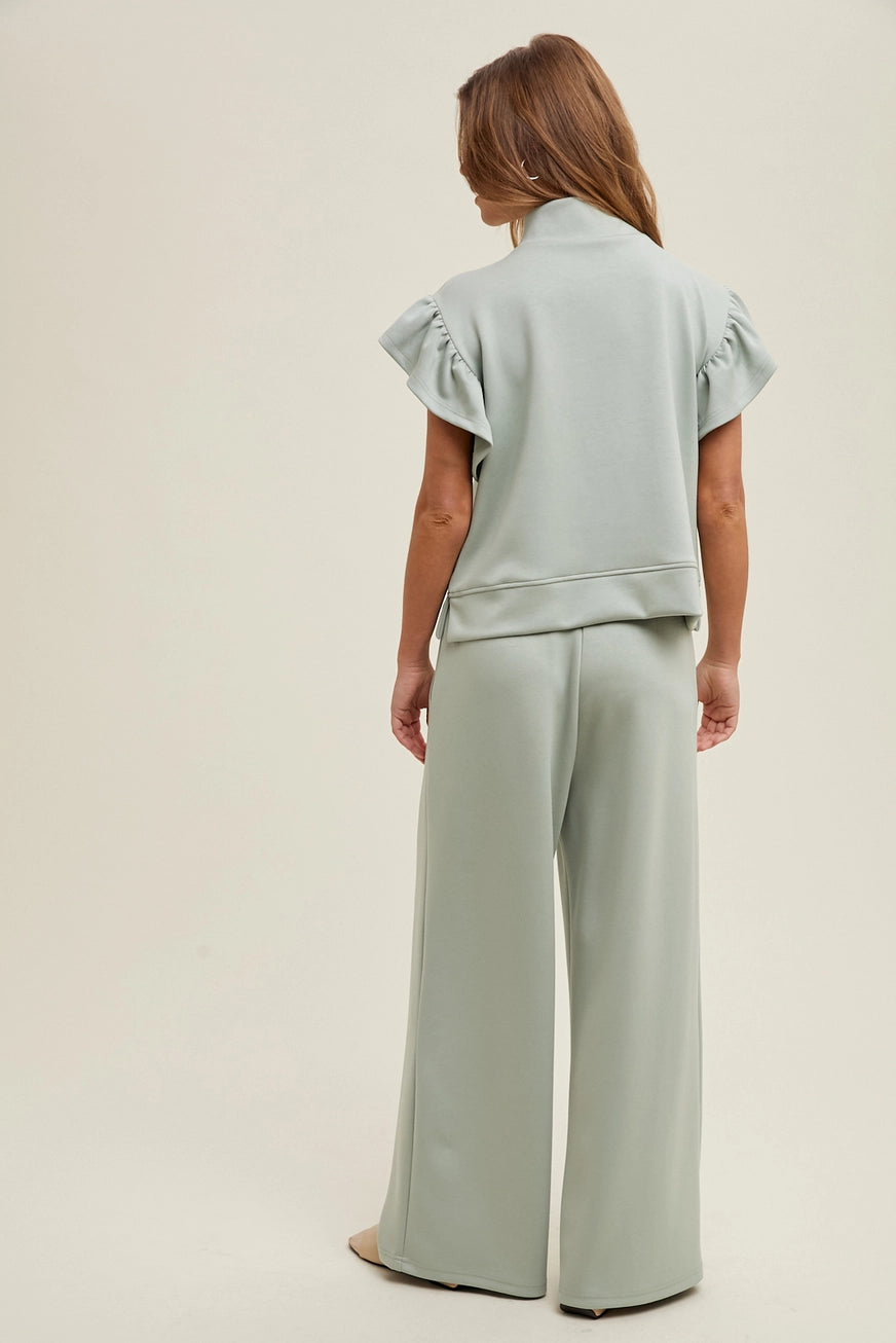 SCUBA TOP AND PANTS SET - TOP: HALF-ZIP CLOSURE, RUFFLE SLEEVE, SIDE SLITS - BOTTOM: ELASTIC WAISTBAND WITH DRAWSTRING, SIDE POCKETS, WIDE LEG