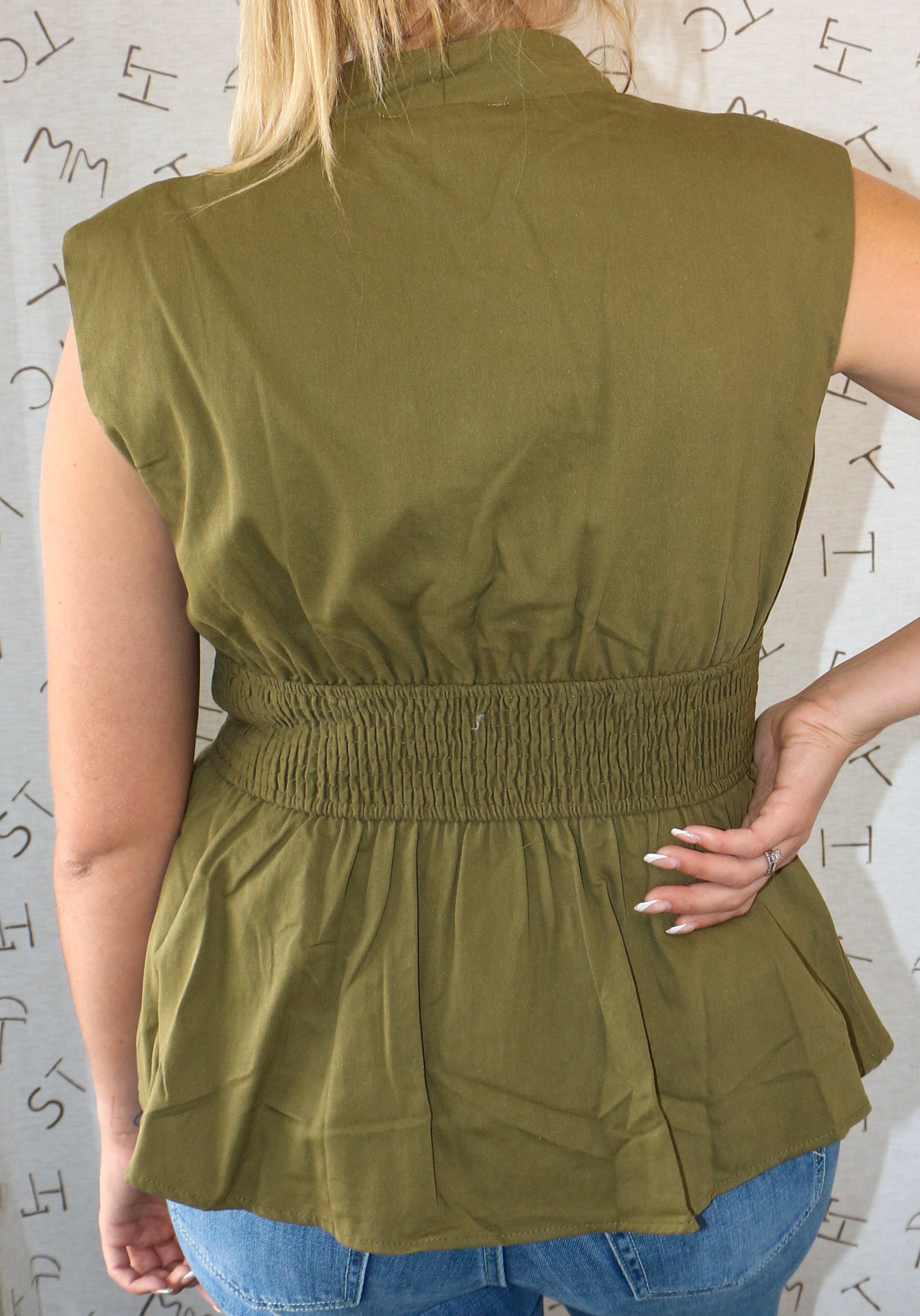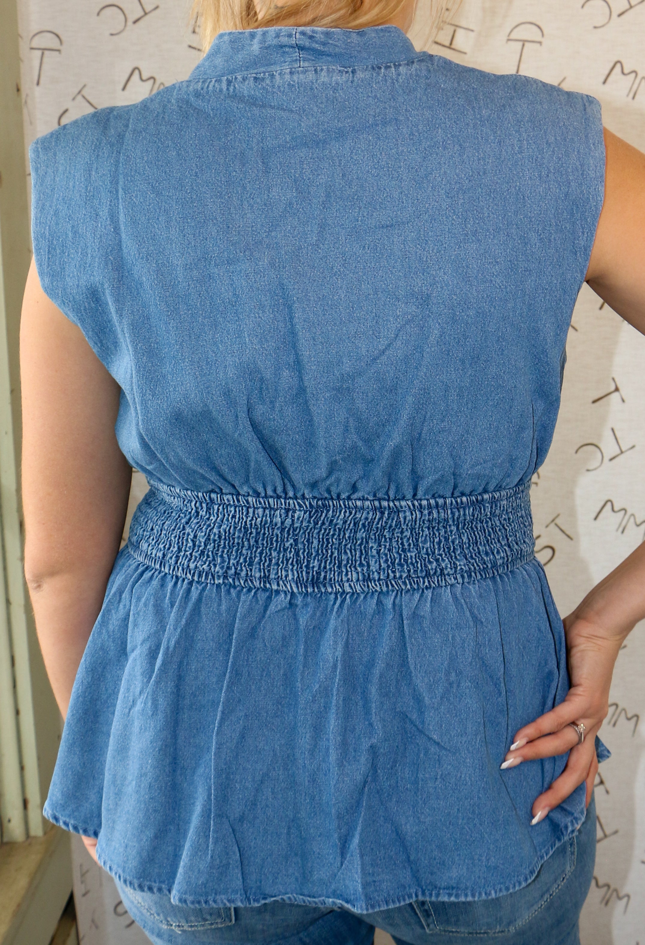 Solid sleeveless denim peplum top featuring wide smocked waist and zipper closure at front. Unlined. Woven. Non-sheer. Lightweight.