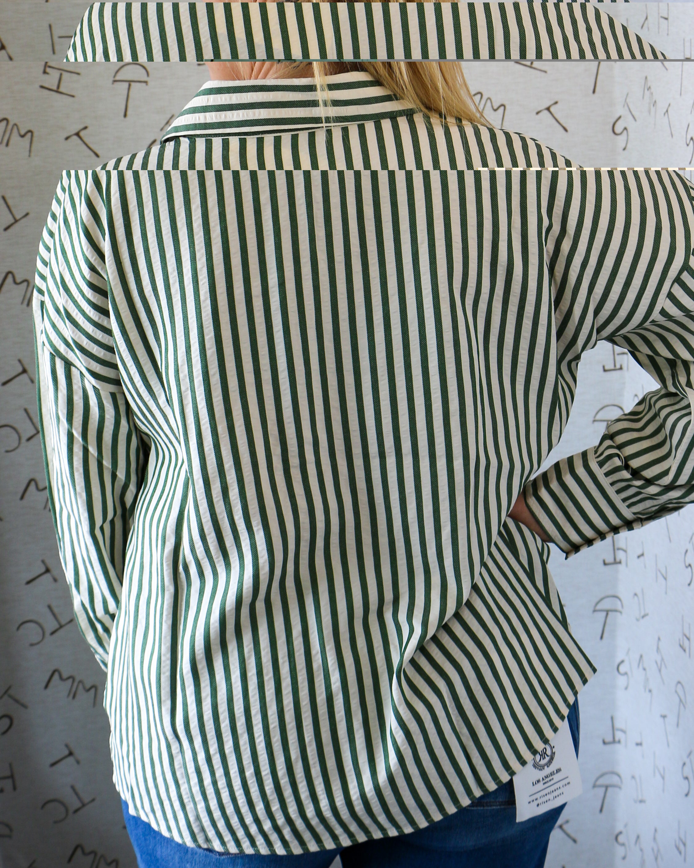 Striped long sleeve button-down top featuring front self-tie detail. Button closure at front. Buttoned cuffs. Unlined. Woven. Non-sheer. Lightweight.